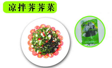制作方法:速凍薺薺菜250克,解凍后放入開水中過水2—3分鐘撈出沖涼,擠干水分,改刀切成20—30 m m的小段,然后與適量的鹽、味精、香醋、麻油拌勻即可上盤,堆成塔狀。