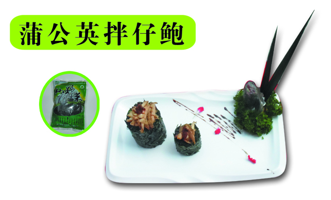 制作方法:待蒲公英解凍后放入開水中,過水2—3分鐘,撈出沖涼,擠出水分,改刀切成2—3 m m長的小段與適量的精鹽、味精、花椒油、蒜茸、麻油拌勻,放入圓型模具里,鮑魚去殼洗凈、高壓3分鐘,待涼后切片用鼓油、XO醬拌勻,放入圓形蒲公英上面。